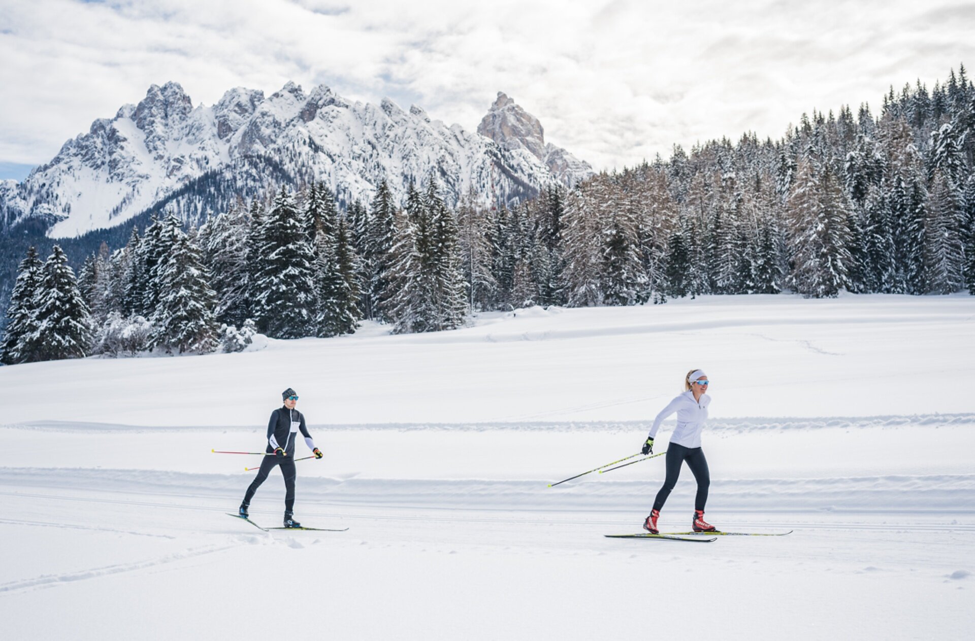 Die Langlaufloipe führt vom Langlaufstadion Nordic Arena durch eine malerische Winterlandschaft bis zu den Rienzliften und weiter nach Altschluderbach.