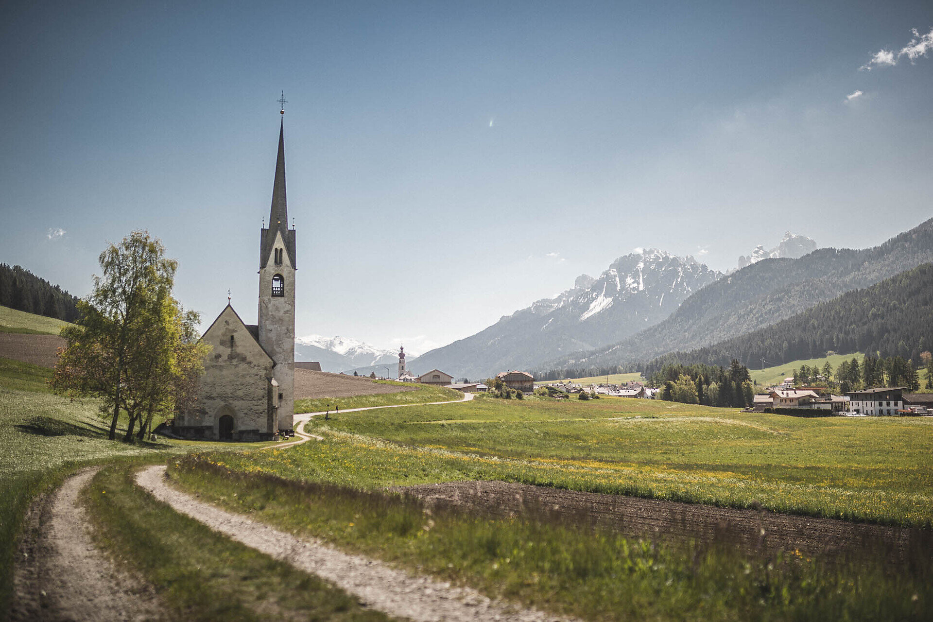 Von dort führt der Weg am Waldrand entlang in Richtung der idyllisch gelegenen Mooskirche – stets begleitet von einem herrlichen Blick auf das Dorf Niederdorf und die beeindruckende Bergkulisse der Pragser Dolomiten.