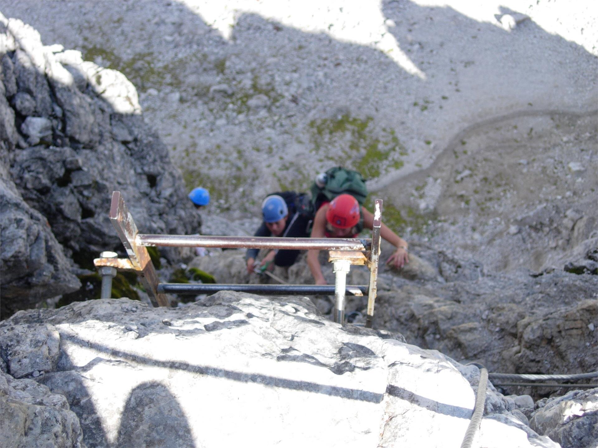 Hinter der Drei Zinnen Hütte führt ein Pfad aufwärts in Richtung des Gipfels, wo nach wenigen Metern ein Wegweiser steht. Der Gipfel wird linksseitig umgangen und über schon in beachtlierch Höhe ausgsetzte Bänder wird der Einstieg des "Dolomitenfreunde-Klettersteigs" erreicht. Nun geht es zwar ausgesetzt und teilweise recht abenteuerlich, grundsätzlich aber problemlos, ca. 140 m überwiegend über Stahlleitern (ca. 17 Stück) zum Gipfel. Echte Höhepunkte sind ein recht breiter Kamin, in dem man von einer Wand in die andere wechseln muss (Zwergentod!) und eine Querung auf rutschigen verbogenen Haken in steiler Wand. Der Abstieg erfolgt über den gut gekennzeichneten und völlig problemlosen "Feldkurat-Hosp-Steig".