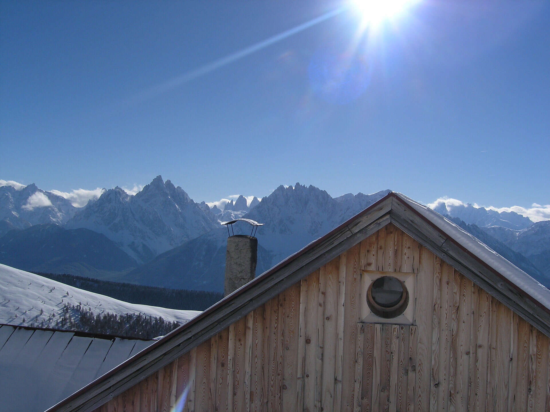 Die Bonnerhütte (im Winter geschlossen), welche sich auf 2.340 m Meereshöhe befindet, bietet eienen Ausblick auf die verschneiten Dolomitengipfel. Unter ihnen auch die bekannten Drei Zinnen.
