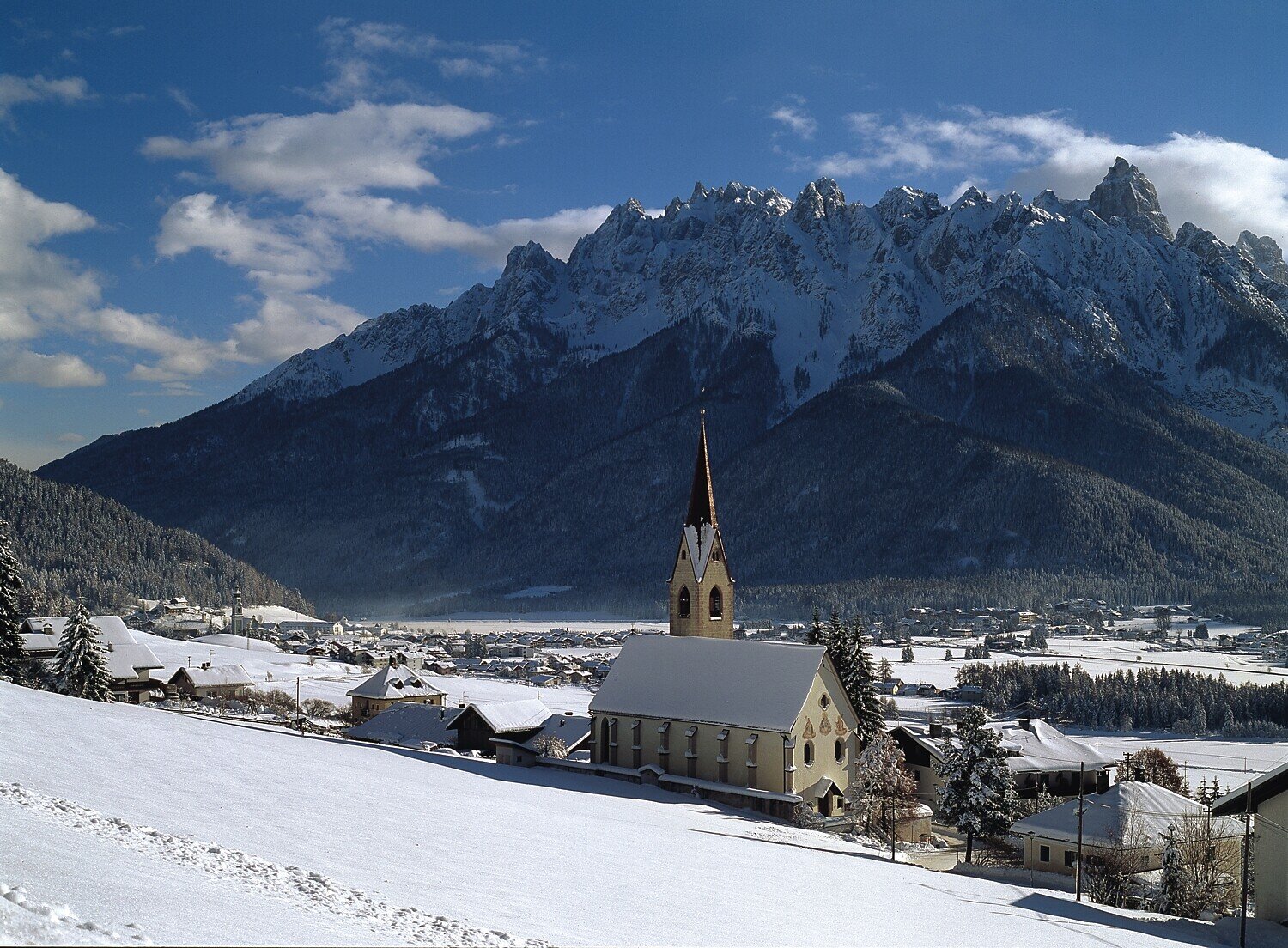 Die Schneeschuhwanderung auf der Sonnensteite von Toblach bietet einen wunderschönen Blick ins verschneite Höhlensteintal und auf den Toblacher See.
