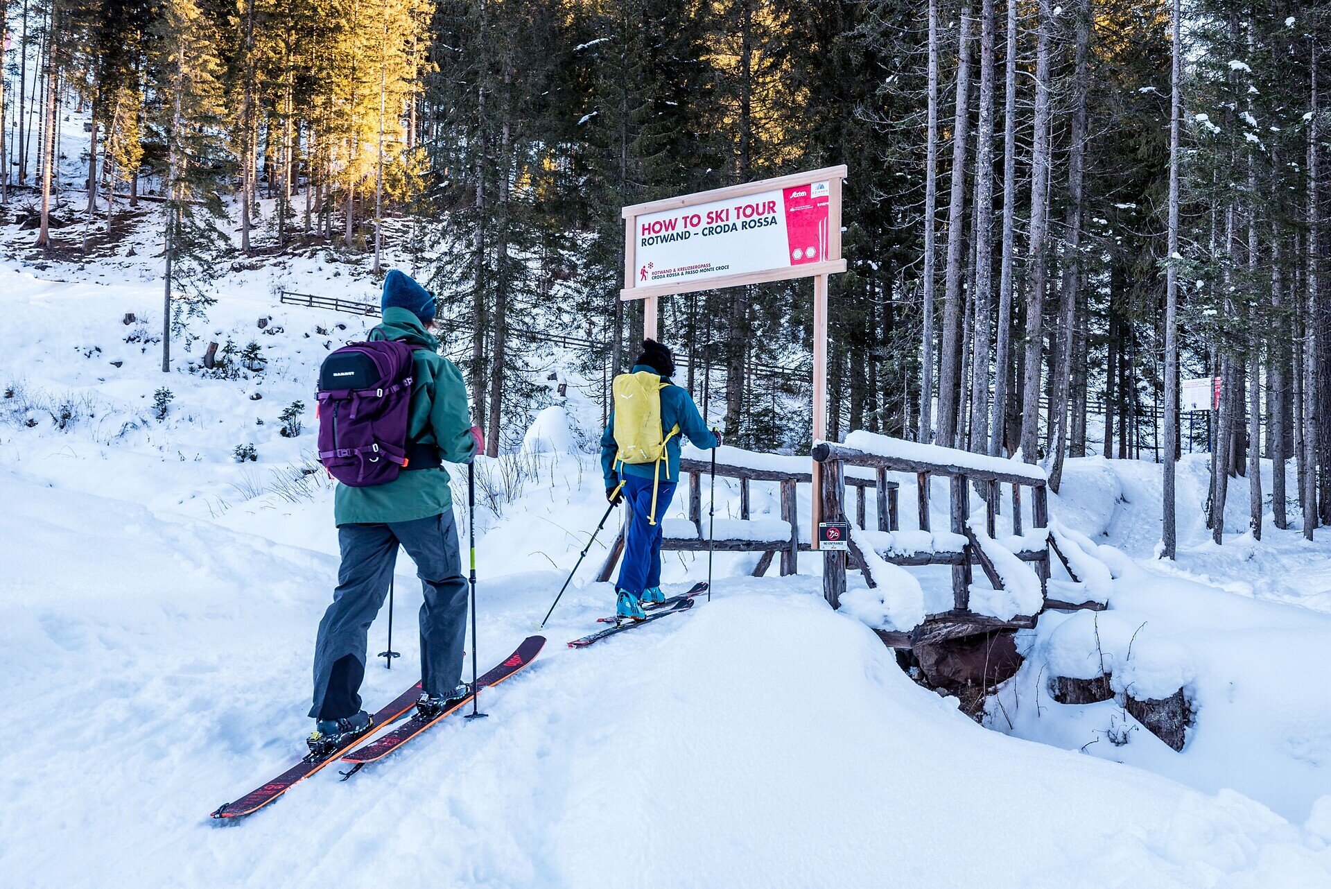 ACHTUNG: Der erste Abschnitt des Skitourenlehrpfades ist derzeit teilweise schneefrei. Bitte folgen Sie daher der Hauptstraße für ca. 200 Meter in Richtung Kreuzbergpass und biegen Sie anschließend bei der Beschilderung rechts in den Wald ab und beginnen dort mit der Skitour.