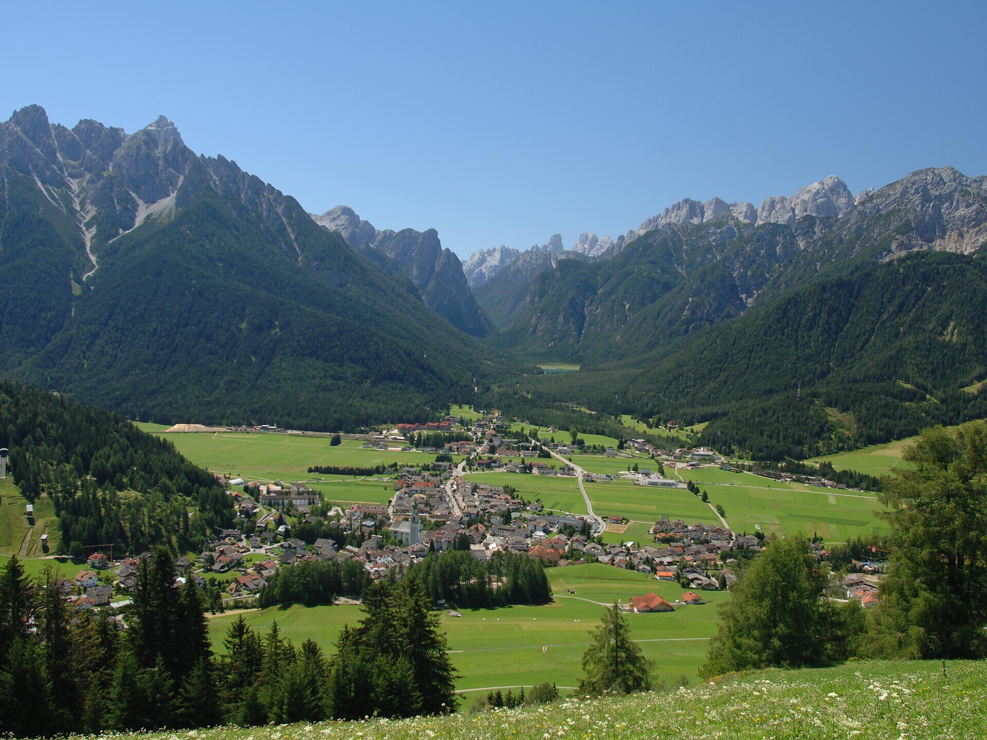 Ratsberg befindet sich oberhalb von Toblach mit einem schönen Blick auf das Dorf und die Dolomiten.