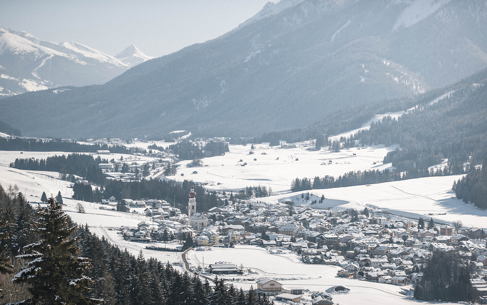 Schon bald erreichst du über die Straße den Aussichtspunkt „Schöne Aussicht“ auf 1.460 Metern. Wie der Name verspricht, erwartet dich hier ein traumhaftes Panorama über das grüne Pustertal – ein idealer Ort für eine genussvolle Rast, zum Innehalten und Durchatmen.