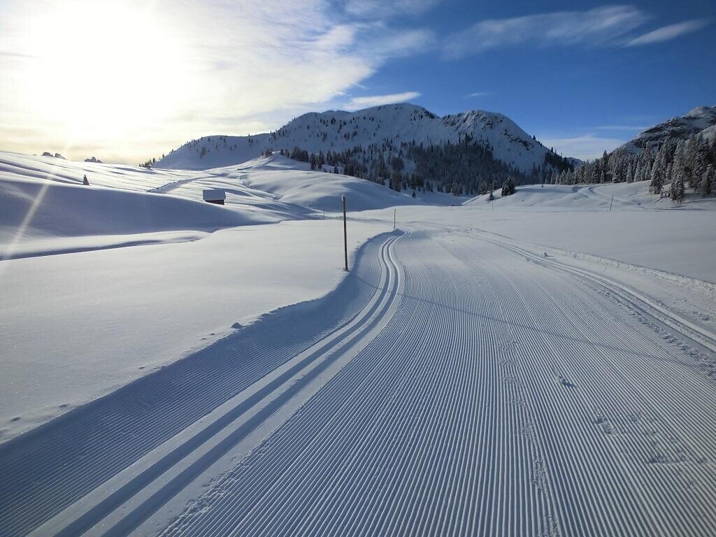 Den Loipeneinstieg findest du direkt bei den Pragser Skiliften. Die Loipe führt am Anfang etwas abwärts, du läufst dann immer geradelang bis du zu einem etwas schwierigen Anstieg kommst. Am höchtsen Punkt angekommen sind, fehlen dir nur noch wenige Meter bis nach Brückele.