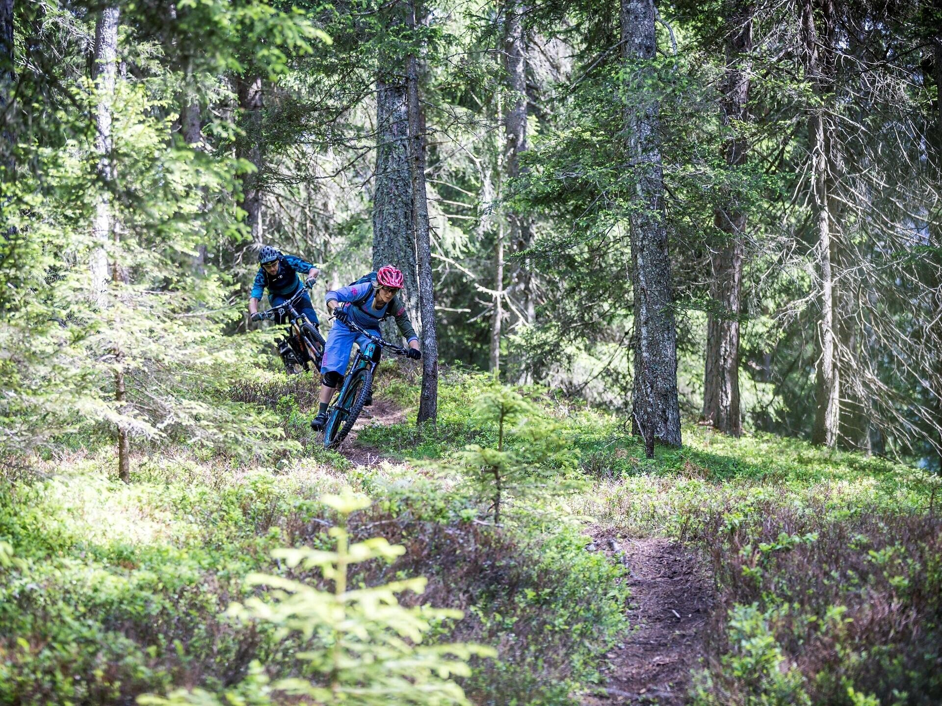 Mittelschwierige Linie mit natürlichen Elementen wie Wurzeln und Steinen, enge Kurven und Holzelemente.