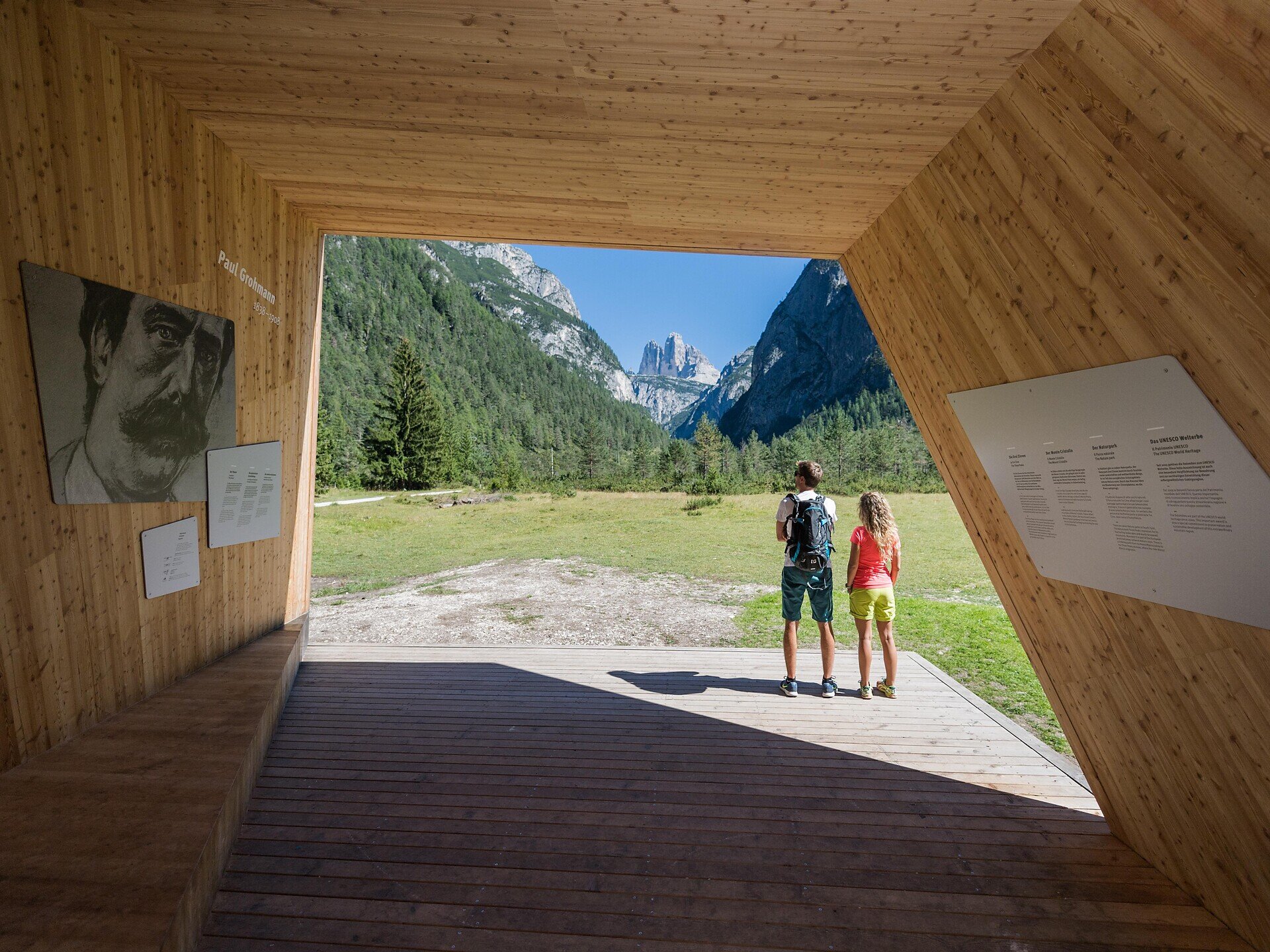 Drei-Zinnen-Blick: Das Portal an der Straße als Blickfang und die überdachte Plattform in Holz sind der eigentliche Anlaufpunkt und somit der wichtigste Teil des Themenwegekonzeptes. Bei dieser Station werden die Themen Dolomiten UNESCO Welterbe, Naturpark Drei Zinnen und Bergsteigergeschichte mit dem Pionier Paul Grohmann behandelt, welcher am 21. August 1869 vom Höhlensteintal aus startete, um die Drei Zinnen erstmals zu besteigen.
