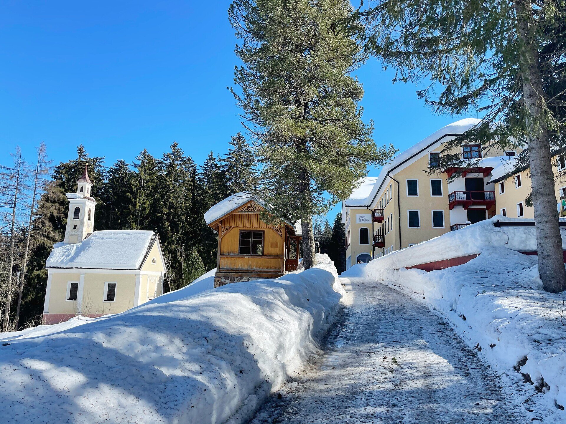Vom Hauptplatz in Niederdorf startet diese ruhige und genussvolle Winterwanderung entlang des Wanderwegs Nr. 27 in Richtung Maistatt. Der teils asphaltierte, gut begehbare Weg führt durch eine stille, verschneite Landschaft – vorbei an offenen Feldern, alten Bäumen und schneebedeckten Weidezäunen.